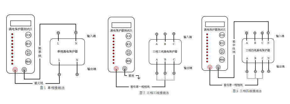 漏電保護(hù)器測(cè)試儀使用時(shí)接線示意圖說(shuō)明及介紹: